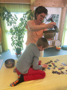 Confortablement installé sur la table de massage, les sons des bols sont joués tout autour de vous, posés sur vous.